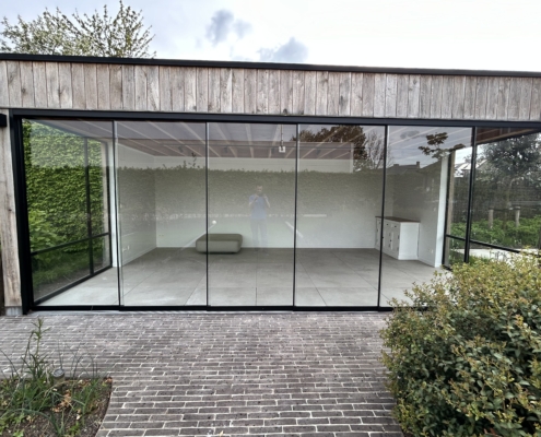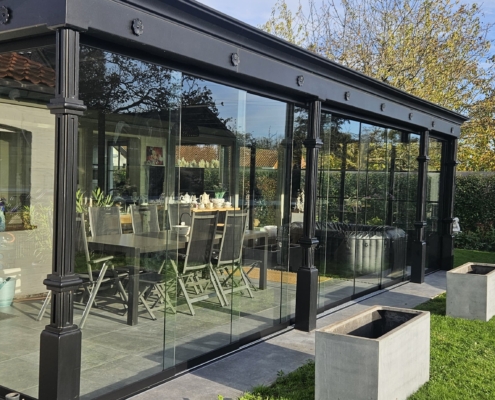 Door middel van glazen schuifwanden sluit je jouw terrasoverkapping perfect af en zit je er altijd comfortabel en droog bij.